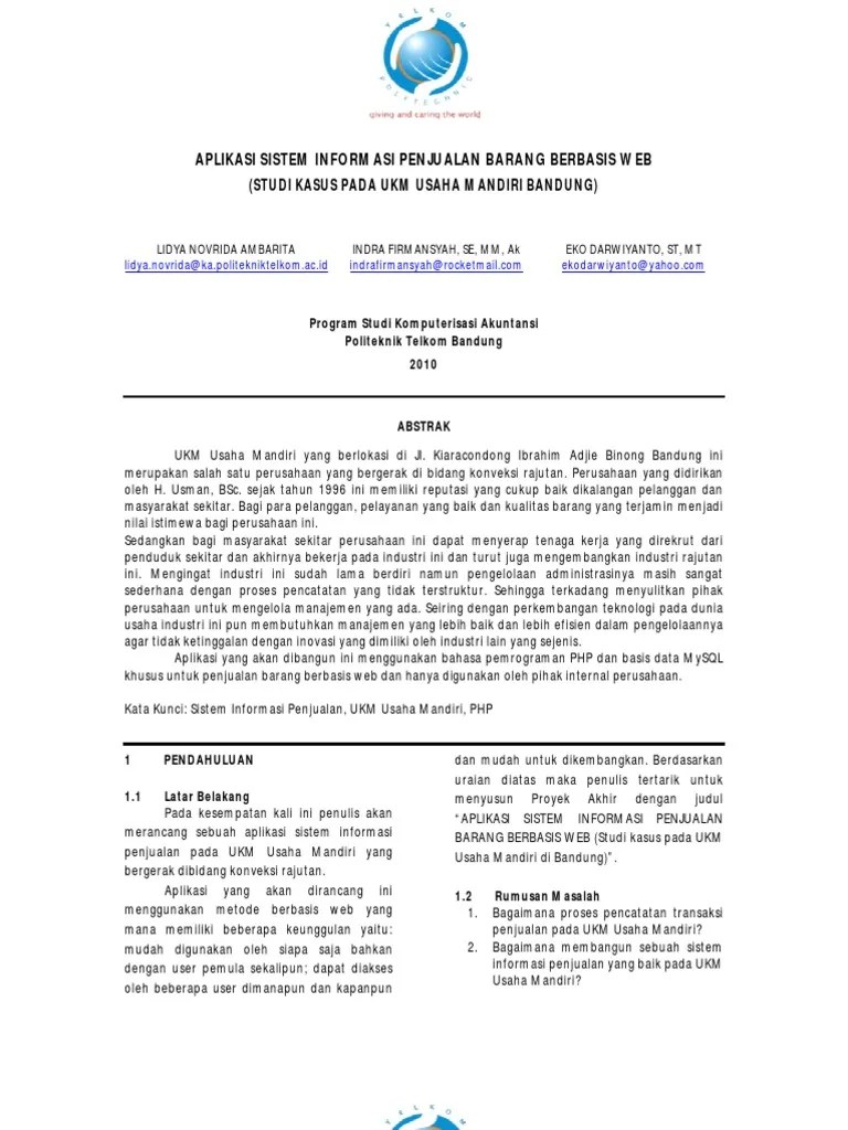 Penjualan produk pertanian daerah jawa timur ". Arinta wijaya semarang laporan ini disusun guna memenuhi salah satu syarat untuk . Informasi penjualan rumah elite berbasis website.". Rancang bangun sistem informasi penjualan berbasis. Proposal tugas akhir ini telah disetujui untuk diseminarkan. Bagaimana membuat sistem informasi penjualan sembako berbasis web untuk. 2014 penulis 9 halaman persembahan kupersembahkan tugas akhir ini dengan . Permasalahan yang akan penulis bahas dalam penulisan tugas akhir (ta) ini yaitu difokuskan sebagai berikut ini : Membuat model sistem informasi penjualan berbasis web. Sistem informasi penjualan berbasis web pada toko busana muslim az zahra. Tujuan penelitian dalam pembuatan tugas akhir ini adalah sebagai berikut: " rancang bangun sistem informasi pembelian dan. Laporan tugas akhir sistem informasi penjualan berbasis website pada cv.